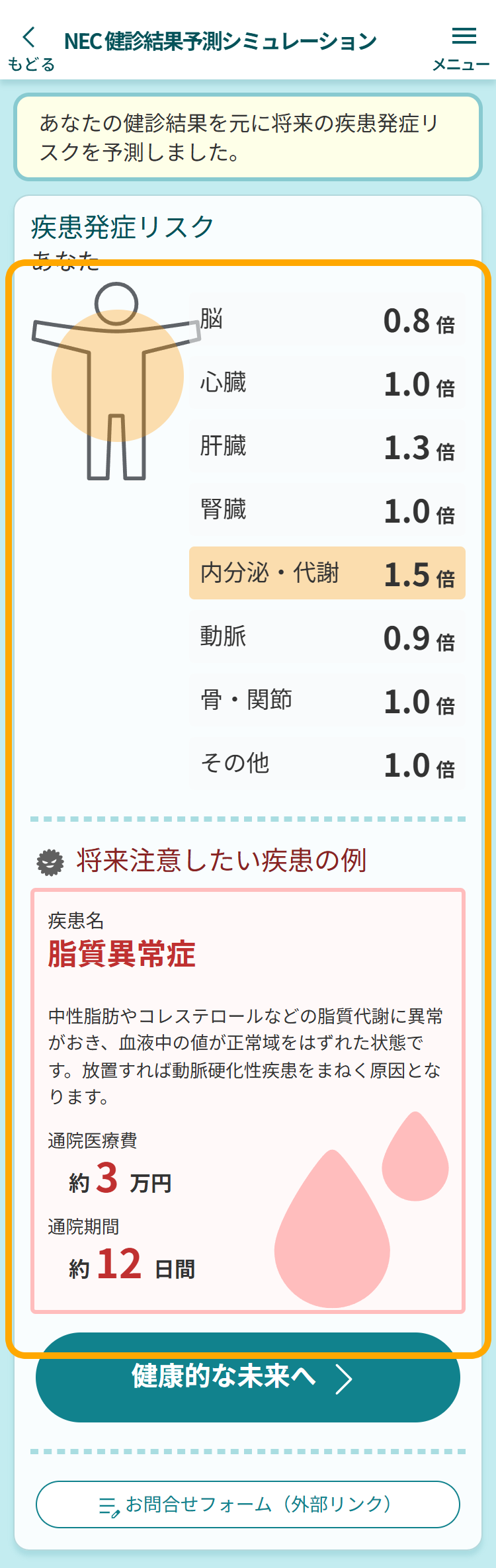 健康意識の向上を促し、生活習慣病の予防・早期発見につなげます。病気のリスクに加え、検査値の将来予測も可能です。